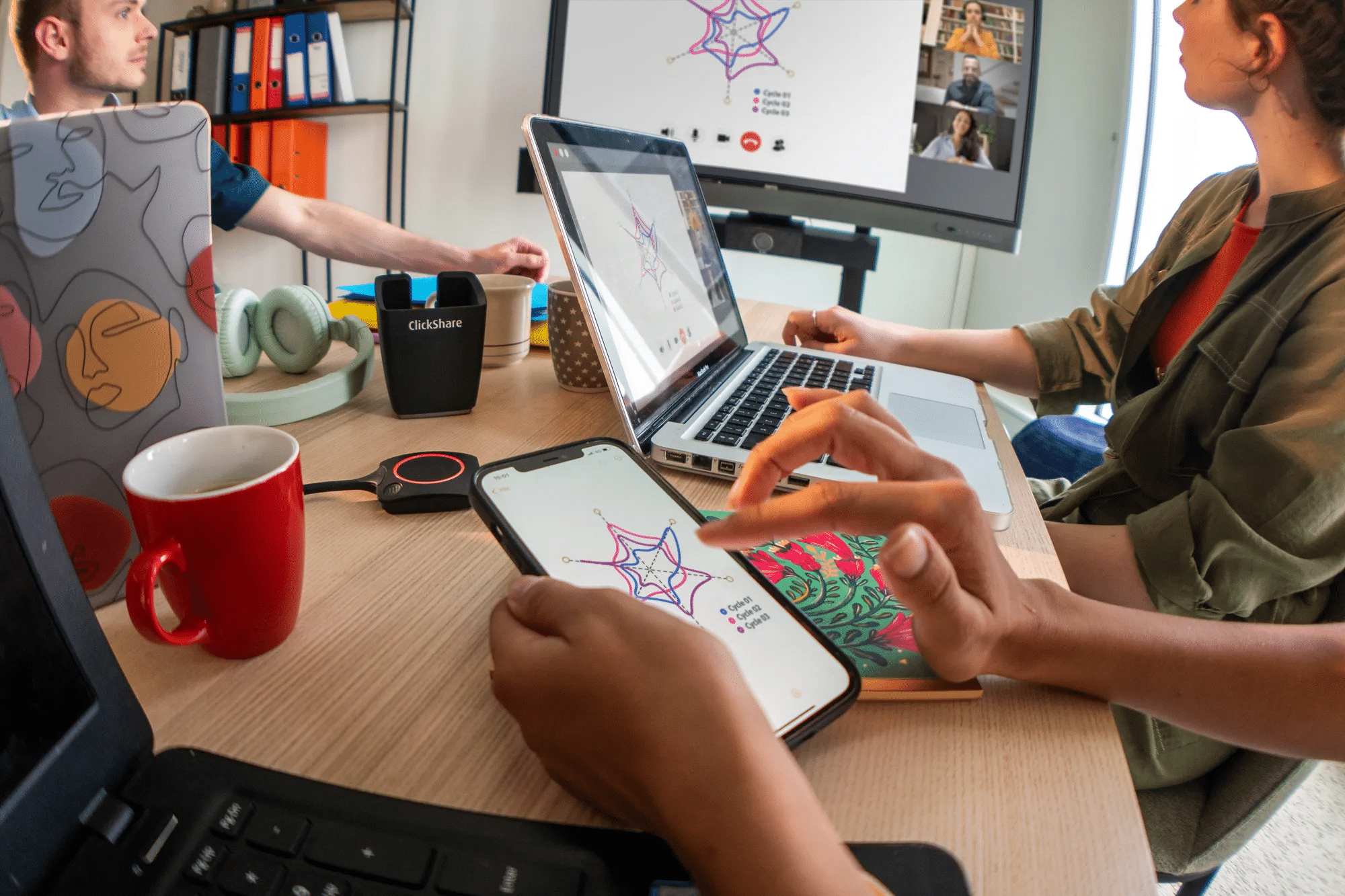 ClickShare ist ein preisgekröntes kabelloses Konferenzsystem der Firma BARCO, das problemlose Videobesprechungen, eine reibungslose Zusammenarbeit und wirkungsvolle Präsentationen ermöglicht. Das System verbindet sich über Ihren Laptop mit dem Audio- und Video-Equipmen in Ihrem Konferenzraum, sodass Sie in weniger als 7 Sekunden ein Meeting starten können. Ein Klick auf den ClickShare Button oder in der App genügt.